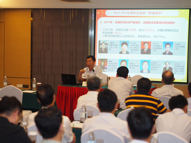 姚洪勝同志在整場報告中圍繞“黨風(fēng)廉政建設(shè)和反腐敗斗爭形勢的演變”這條主線,分別從十八大之前腐敗問題“愈演愈烈”和2013-2015年兩軍對壘的“膠著狀態(tài)”、2016年“壓倒性態(tài)勢正在形成”到2017年“壓倒性態(tài)勢已經(jīng)形成”的多重視角,用樸實生動的語言向在場聽眾全面闡述了黨風(fēng)廉政建設(shè)和反腐敗是一場輸不起的斗爭。報告通過黨的十八大以來典型腐敗案例——進(jìn)行權(quán)錢交易的原廣東省茂名市委書記羅蔭國、杭州市原副市長許邁永;權(quán)色交易的前中國人民解放軍海軍副司令員王守業(yè)、前陜西省政協(xié)副主席龐家鈺;權(quán)權(quán)交易的湖南湘潭縣副縣長徐韜;集多種腐敗于一身的原解放軍總后勤部副部長(中將軍銜)谷俊山等一個個鮮活案例,深入剖析了他們腐敗墮落的軌跡、原因及其教訓(xùn),深層次分析腐敗典型案例當(dāng)事人的心理失衡、權(quán)力失控、底線失守、行為失范、監(jiān)督失靈,把國家和人民賦予的神圣權(quán)力,當(dāng)成了謀取不義之財、謀取私利的工具,在政治上喪失信念、經(jīng)濟(jì)上貪婪、生活上腐化,從而把自己送上了不歸路,報告以案說紀(jì)發(fā)人深省。