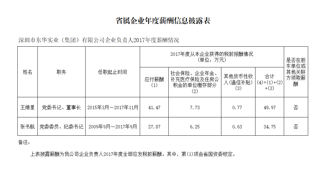 深圳市東華實(shí)業(yè)(集團(tuán))有限公司2017年度企業(yè)負(fù)責(zé)人薪酬披露
