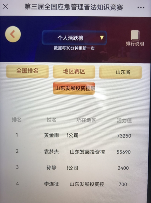 此次主題為“增強法治觀念,推進依法應急”競賽活動為期一個月,分為集訓營、實戰(zhàn)營、總決賽等三個階段。東華物業(yè)公司高度重視此次競賽活動,委派東華園安全負責人黃金雨同志參賽。黃金雨同志深入學習競賽活動內容,圍繞安全生產和應急管理普法工作,仔細研究法律法規(guī)條文,及時跟蹤競賽活動進展,準確把握競賽活動要求,做到學法、知法、懂法、用法,以賽促學、學以致用,最終取得山東發(fā)展投資集團個人活躍榜第一名的優(yōu)異成績,為公司爭得了榮譽。