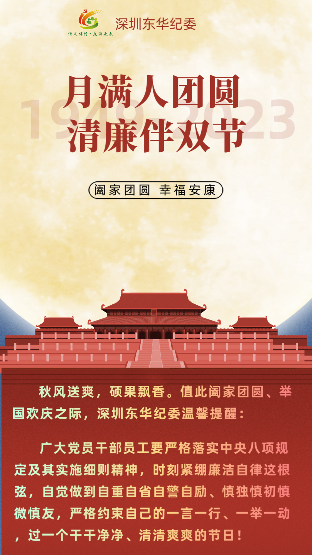 [導(dǎo)讀] 秋風(fēng)送爽,碩果飄香。值此闔家團(tuán)圓、國歡慶之際,深圳東華紀(jì)委溫馨提醒:廣大黨員干部員工要嚴(yán)格落實(shí)中央八項(xiàng)規(guī)定及其實(shí)施細(xì)則精神,時(shí)刻緊繃廉潔自律這根弦,自覺做到自重自省自警自勵(lì)、慎獨(dú)慎初慎微慎友,嚴(yán)格約束自己的一言一行、一舉一動(dòng)、過一個(gè)干干凈凈、清清爽爽的節(jié)日!